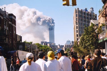 HOME | NEWS On September 11 the United States came face-to-face with the ugly visage of terrorism when two hijacked planes crashed into the World Trade Center in New York and one rammed into America's power-centre, Pentagon. Close to 4000 people lost their lives in the terror attacks prompting an infuriated US to launch a massive air raid on Afghanistan in search of suspect Osama bin Laden. Photo : Paresh Gandhi |
