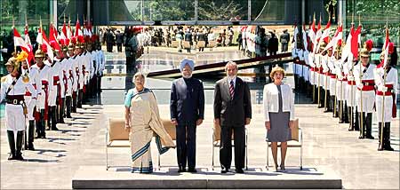 Image: Brazilian President Luiz Inacio Lula da Silva, his wife Marisa Leticia, Dr Manmohan Singh and his wife Guarsharan Kaur at the ceremonial welcome.